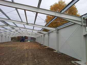 Die tragende Konstruktion wird durch das Stahlrahmenskelett in Kombination mit der Dach- und Wandschalung. Das ...