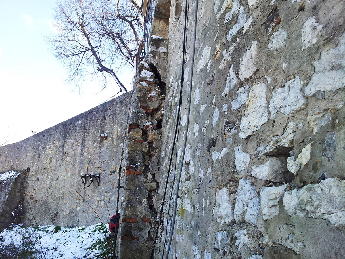 Oporný pilier je situovaný v murive opevnenia SZ múru nad budovou Trenčianskeho múzea. Oporný pilier zabezpečoval stabilitu rohu objektu nad administratívnou budovou. Nosná konštrukcia je tvorená kamenným riadkovým murivom. V rámci rekonštrukcie bola vypracovaná kompletná rekonštrukcia oporného piliera pre znovuobnovenie jeho opornej funkcie. Bolo potrebné riešiť prikotvenie nového muriva k jestvujúcemu murivu, jeho čiastočnú obnovu, za použitia tradičných technológii z obdobia výstavby. V rámci rekonštrukcie boli odobrané vzorky z muriva pre stanovenie jeho pevnostných charakteristík. Pri rekonštrukciách historických pamiatok dodržiavame medzinárodné dohody pre rekonštrukciu pamiatkových objektov ICOMOS, ktoré kladú špeciálne nároky na malty a murovací materiál.
